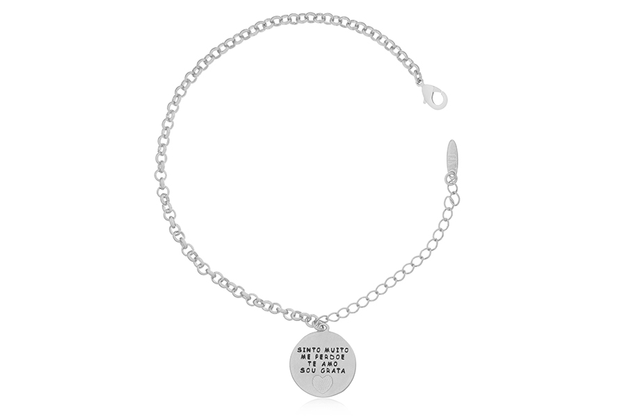 PULSEIRA BANHADA EM RÓDIO BRANCO, ELO PORTUGUÊS 2,50mm, 16cm COMPRIMENTO, E PONTO DE LUZ 4,50mm E PINGENTE FÉ 11mm DIÂMETRO
