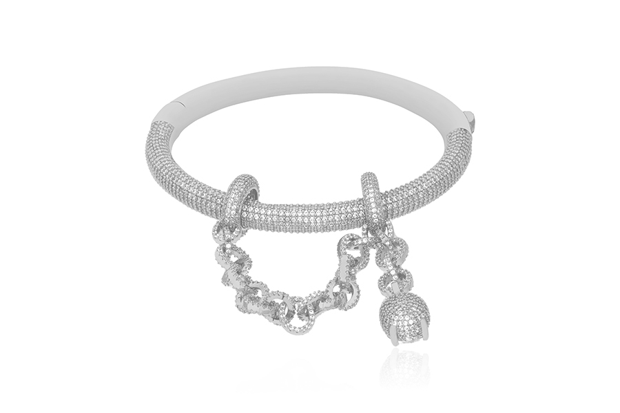 PULSEIRA BANHADA EM RÓDIO BRANCO, ELO OVAL 9x6,50mm, 21cm COMPRIMENTO SEM EXTENSOR E CORAÇÃO 18mm LARGURA COM ZIRCÔNIAS COLORIDAS
