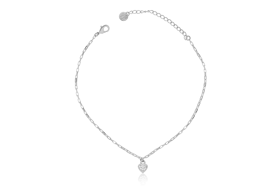 TORNOZELEIRA BANHADA EM RÓDIO BRANCO, ELO PORTUGUÊS 2,50mm ESPESSURA, 22cm COMPRIMENTO, OLHO GREGO 5mm LARGURA E PONTO DE LUZ 3,50mm DIÂMETRO