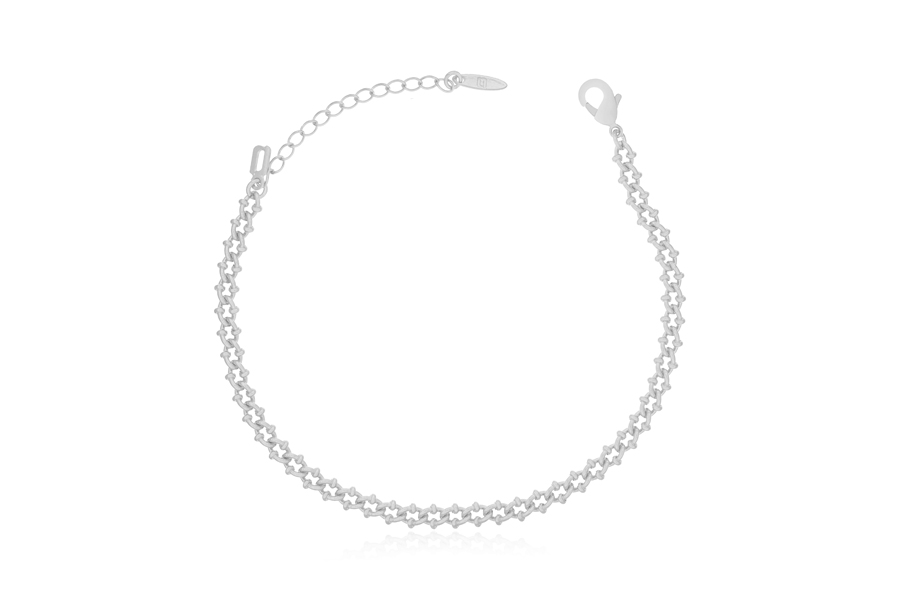 PULSEIRA BANHADA EM PRATA LEVE, DUPLA, ELO 1,50mm ESPESSURA, PONTO DE LUZ 5mm E CORAÇÃO VAZADO 15,50mm LARGURA COM PATA