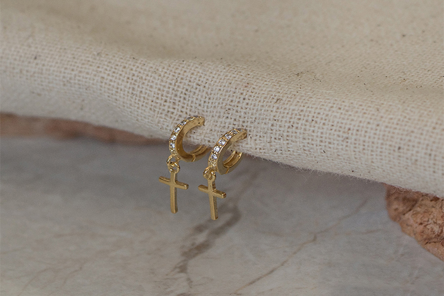 BRINCO BANHADO EM OURO, CRUZ 9mm ALTURA