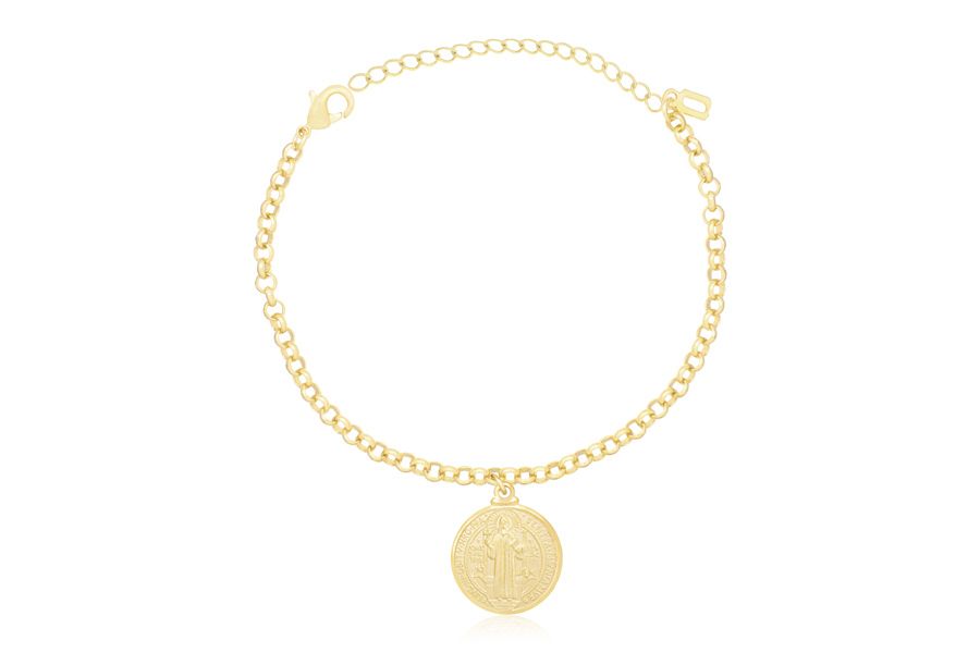 PULSEIRA BANHADA EM RÓDIO BRANCO, ELO PORTUGUÊS 2,50mm, 16cm COMPRIMENTO, E PONTO DE LUZ 4,50mm E PINGENTE FÉ 11mm DIÂMETRO