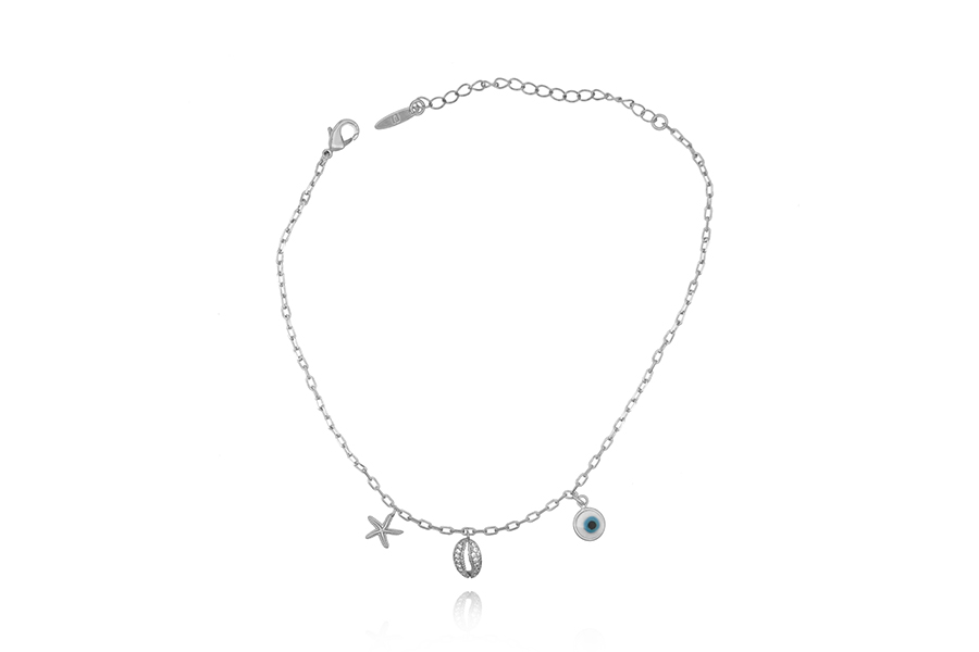 TORNOZELEIRA BANHADA EM RÓDIO BRANCO, ELO 1,90mm LARGURA, 23cm COMPRIMENTO, ESTRELA DO MAR, CONCHA E OLHO GREGO