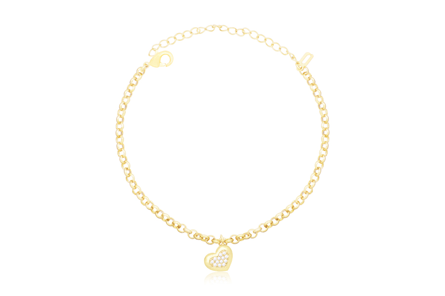 PULSEIRA BANHADA EM OURO, ELO PORTUGUÊS 5mm, 18cm COMPRIMENTO E CORAÇÃO 12mm LARGURA COM ZIRCÔNIAS COLORIDAS