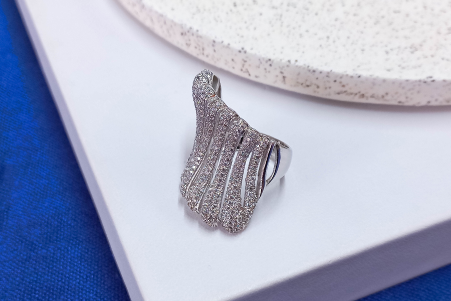 ANEL BANHADO EM RÓDIO BRANCO, 16mm LARGURA E ZIRCÔNIA OVAL 9x7mm