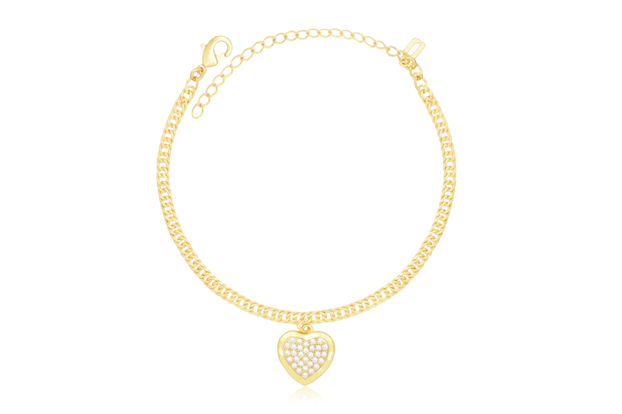 PULSEIRA BANHADA EM OURO, ELO PORTUGUÊS 5mm, 18cm COMPRIMENTO E CORAÇÃO 12mm LARGURA COM ZIRCÔNIAS COLORIDAS