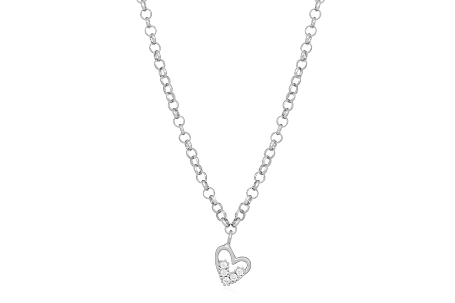 GARGANTILHA EM PRATA, ELO PORTUGUÊS 1,40mm, 40cm, EXTENSOR 5cm, CORAÇÃO 15mm LARGURA, COM BANHO DE RÓDIO BRANCO, COLEÇÃO AURA