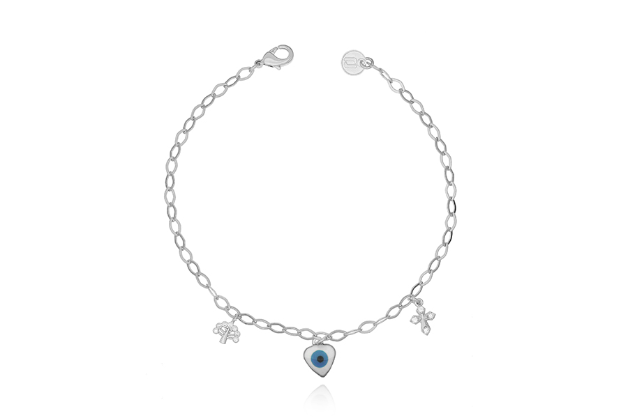 PULSEIRA BANHADA EM RÓDIO BRANCO, INFANTIL, ELO PORTUGUÊS 2,50mm, 14cm COMPRIMENTO, EXTENSOR 3cm COMPRIMENTO E ÁRVORE DA VIDA 17mm DIÂMETRO