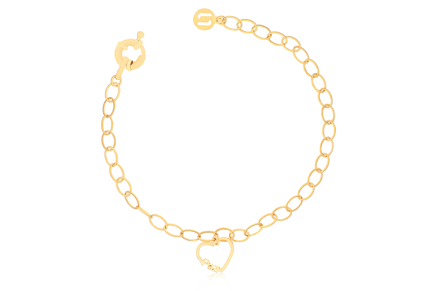PULSEIRA BANHADA EM OURO, ELO PORTUGUÊS 3mm, ELO CORAÇÃO 4,20mm LARGURA, PINGENTE CORAÇÃO 11mm LARGURA COM MENINA