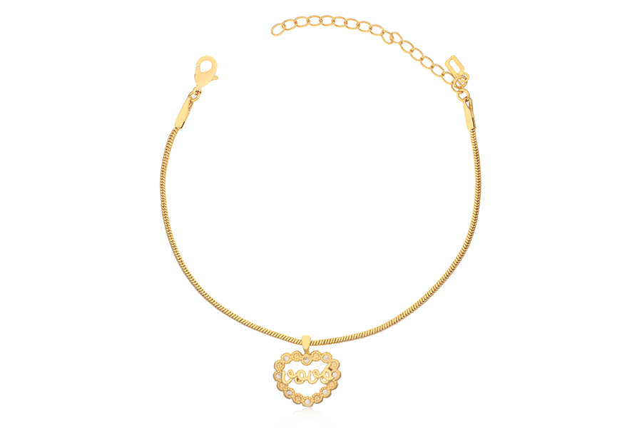 PULSEIRA BANHADO EM OURO INFANTIL ELO PORTUGUÊS 2mm 12cm COMPRIMENTO E CORAÇÃO LOVE 750mm LARGURA