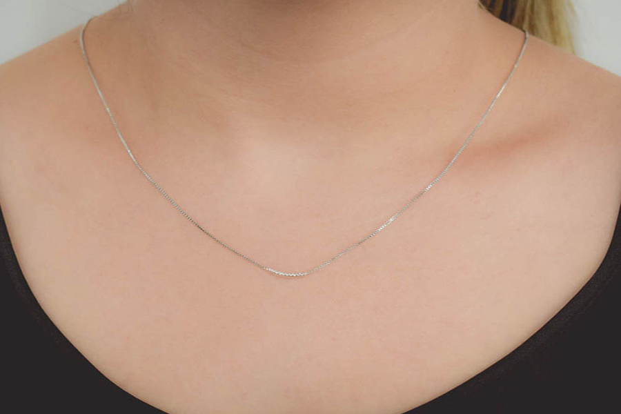 CHOKER BANHADA EM RÓDIO BRANCO, CORRENTE ELO VENEZIANA 0,80mm, 35cm COMPRIMENTO, EXTENSOR 10cm COMPRIMENTO E PESO 1,80g