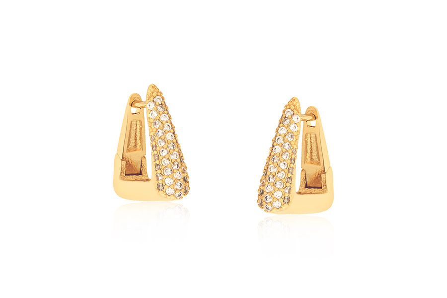BRINCO EM PRATA, 2 TRIÂNGULOS VAZADOS E 1 ZIRCÔNIA, 11,50mm ALTURA