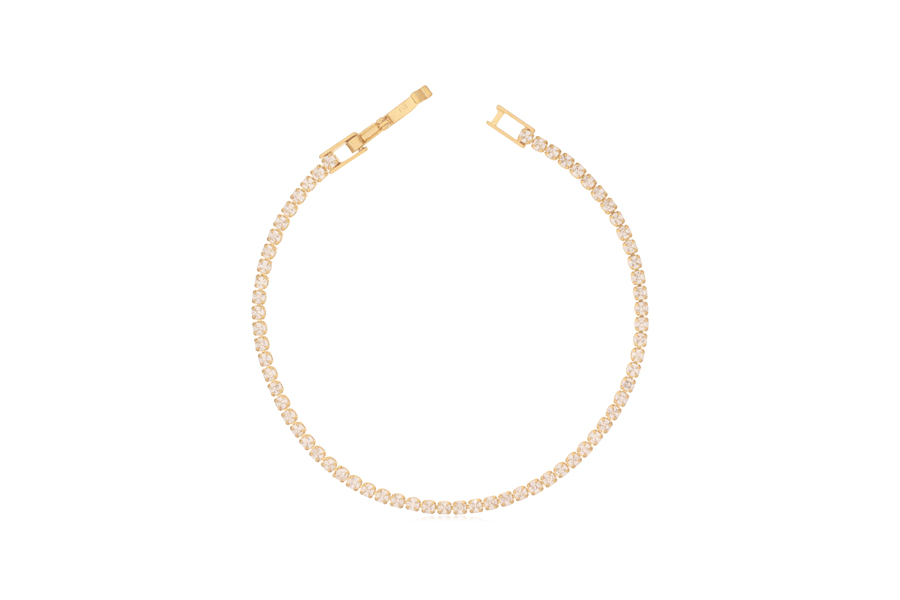 PULSEIRA BANHADA EM OURO, CRISTAL OVAL 11X9mm OU TRIANGULAR 12mm, FECHO GRAVATA, RABO DE RATO 1,40mm E PONTO DE LUZ 3,50mm, COLEÇÃO PINK