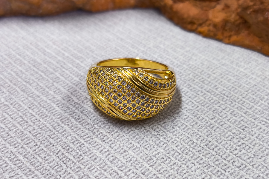 ANEL BANHADO EM OURO, COM 31 ZIRCÔNIAS NAVETE E REDONDA