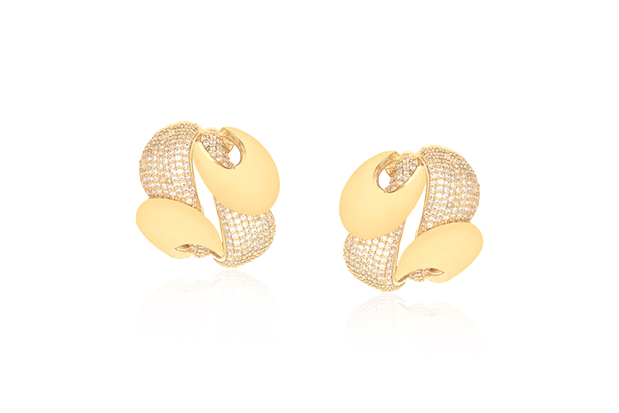 BRINCO BANHADO EM OURO, ASA CRAVEJADA DE BAGUETES E ZIRCÔNIAS REDONDAS NAS PONTAS, 21mm LARGURA