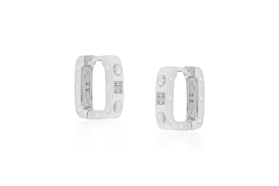 BRINCO EM PRATA, ARGOLINHA CLICK 11,40mm DIÂMETRO, PINGENTE QUADRADO CRAVEJADO 8,40mm LARGURA