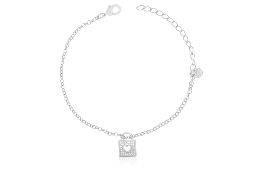 PULSEIRA BANHADA EM RÓDIO BRANCO, ELO OVAL 9x6,50mm, 21cm COMPRIMENTO SEM EXTENSOR E CORAÇÃO 18mm LARGURA COM ZIRCÔNIAS COLORIDAS