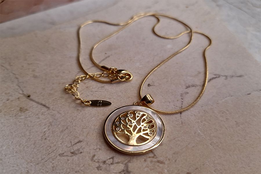 GARGANTILHA BANHADA EM OURO, ELO VENEZIANA, MADREPÉROLA NOSSA SENHORA, COM BORDAS CRAVEJADAS, 45cm COMPRIMENTO, EXTENSOR 3cm