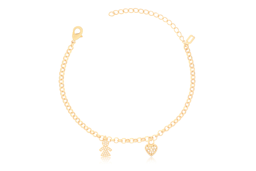PULSEIRA BANHADO EM OURO INFANTIL ELO PORTUGUÊS 2mm 12cm COMPRIMENTO E CORAÇÃO LOVE 750mm LARGURA