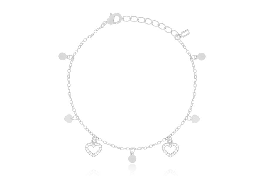 PULSEIRA BANHADA EM RÓDIO BRANCO, ELO OVAL 9x6,50mm, 21cm COMPRIMENTO SEM EXTENSOR E CORAÇÃO 18mm LARGURA COM ZIRCÔNIAS COLORIDAS