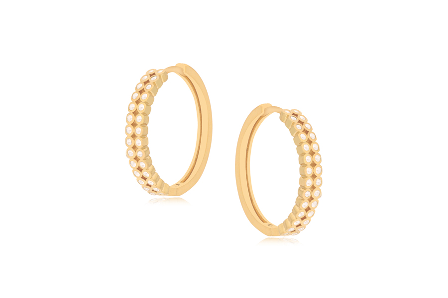 BRINCO BANHADO EM OURO, ASA CRAVEJADA DE BAGUETES E ZIRCÔNIAS REDONDAS NAS PONTAS, 21mm LARGURA