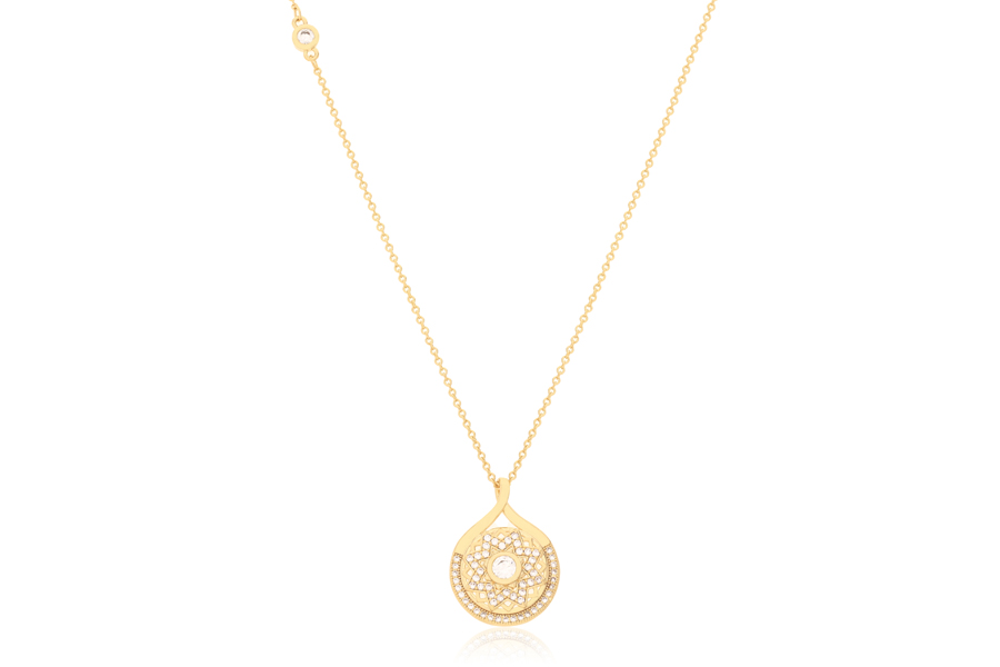 GARGANTILHA BANHADA EM OURO, ELO VENEZIANA, MADREPÉROLA NOSSA SENHORA, COM BORDAS CRAVEJADAS, 45cm COMPRIMENTO, EXTENSOR 3cm