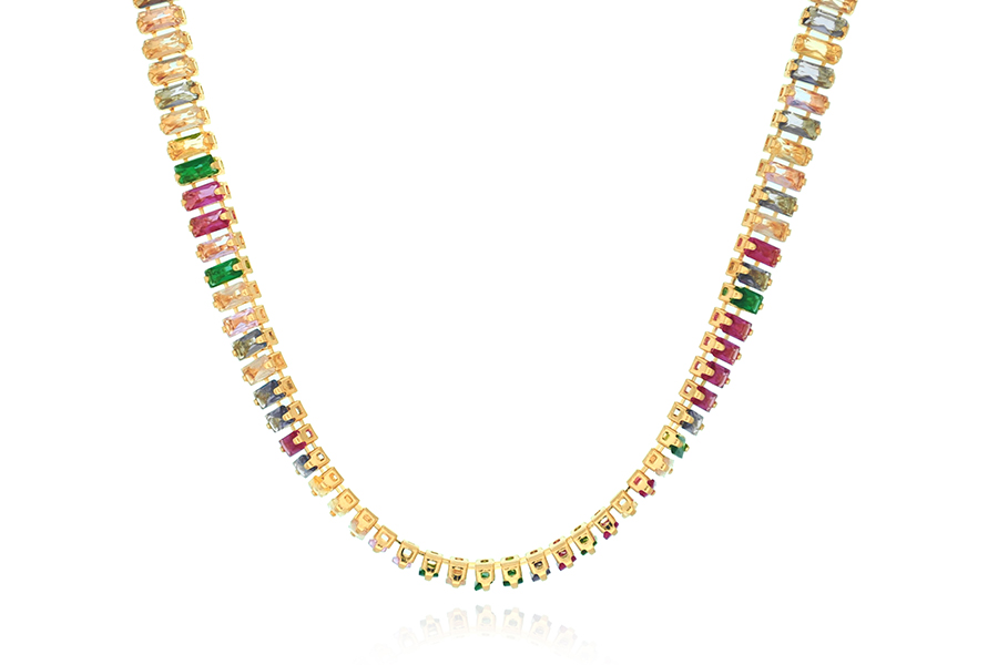 GARGANTILHA BANHADA EM OURO, ELO 2mm, 40cm COMPRIMENTO COM ZIRCÔNIAS QUADRADA 8 E 6mm COLORIDAS
