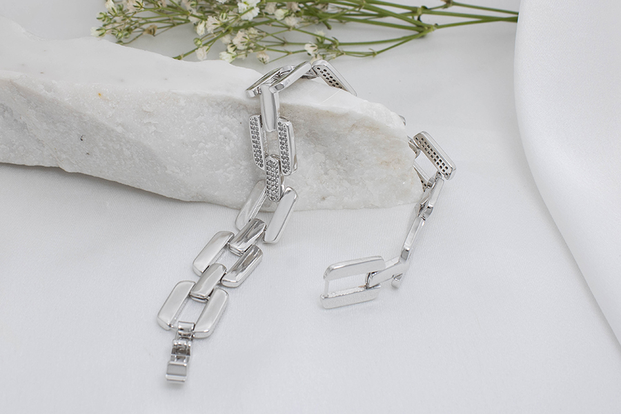 PULSEIRA BANHADA EM RÓDIO BRANCO, CORRENTE ELO 4mm DIÂMETRO, 19cm COMPRIMENTO, EXTENSOR 5cm COMPRIMENTO E PESO 5,20g
