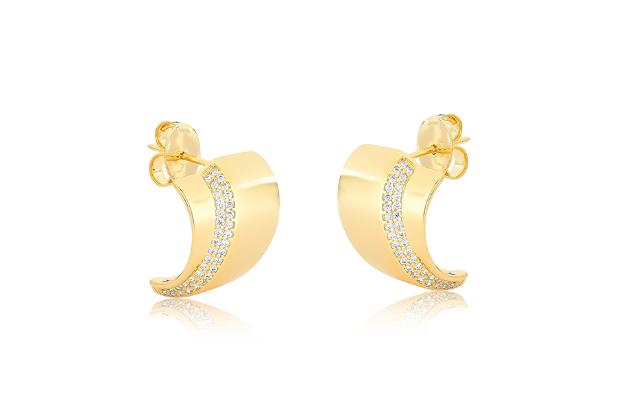 BRINCO BANHADO EM OURO, ASA CRAVEJADA DE BAGUETES E ZIRCÔNIAS REDONDAS NAS PONTAS, 21mm LARGURA